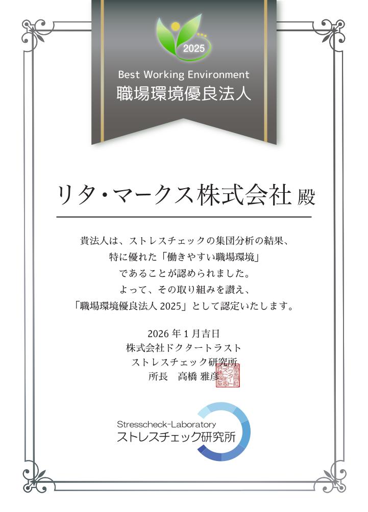 リタ・マークス株式会社はこのたび、ストレスチェックの集団分析結果において、特に優れた「働きやすい職場環境」であることが認められ、「職場環境優良法人 2025」として認定されました。
